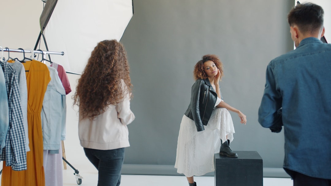 Stylist is putting on trendy hat on young model posing for camera in studio, people are taking photos for glamour magazine. Photography and style concept.